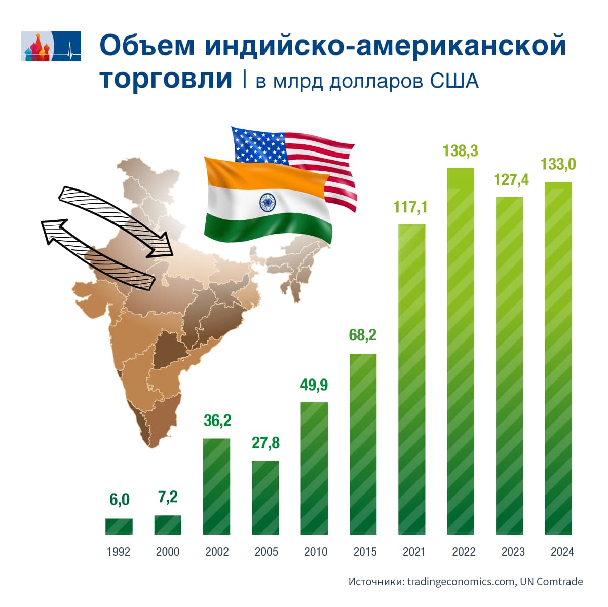 С 1990 по 2000 год торговля между Индией и США выросла более чем в шесть раз: с 6 млрд долларов до 36,2 млрд долларов. С 2015 по 2023 год товарооборот увеличился вдвое: с 68,2 млрд долларов до 133 млрд долларов. Индия и США планируют заключить этой осенью торговое соглашение для дальнейшего увеличения объемов торговли, но теперь этот план будет сложно реализовать.