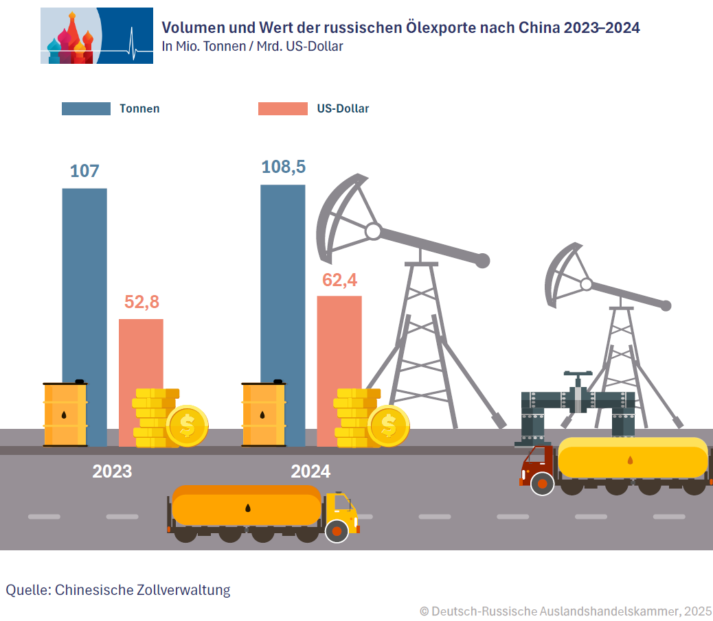 Dieser Preisvorteil führte in den Folgejahren zu steigenden Volumina. 2023 erhöhte sich der russische Ölabsatz nach China auf 107,6 Mio. Tonnen, 2024 sogar auf 108,5 Mio. Tonnen, was rund 2,17 Mio. Barrel pro Tag entsprach.
