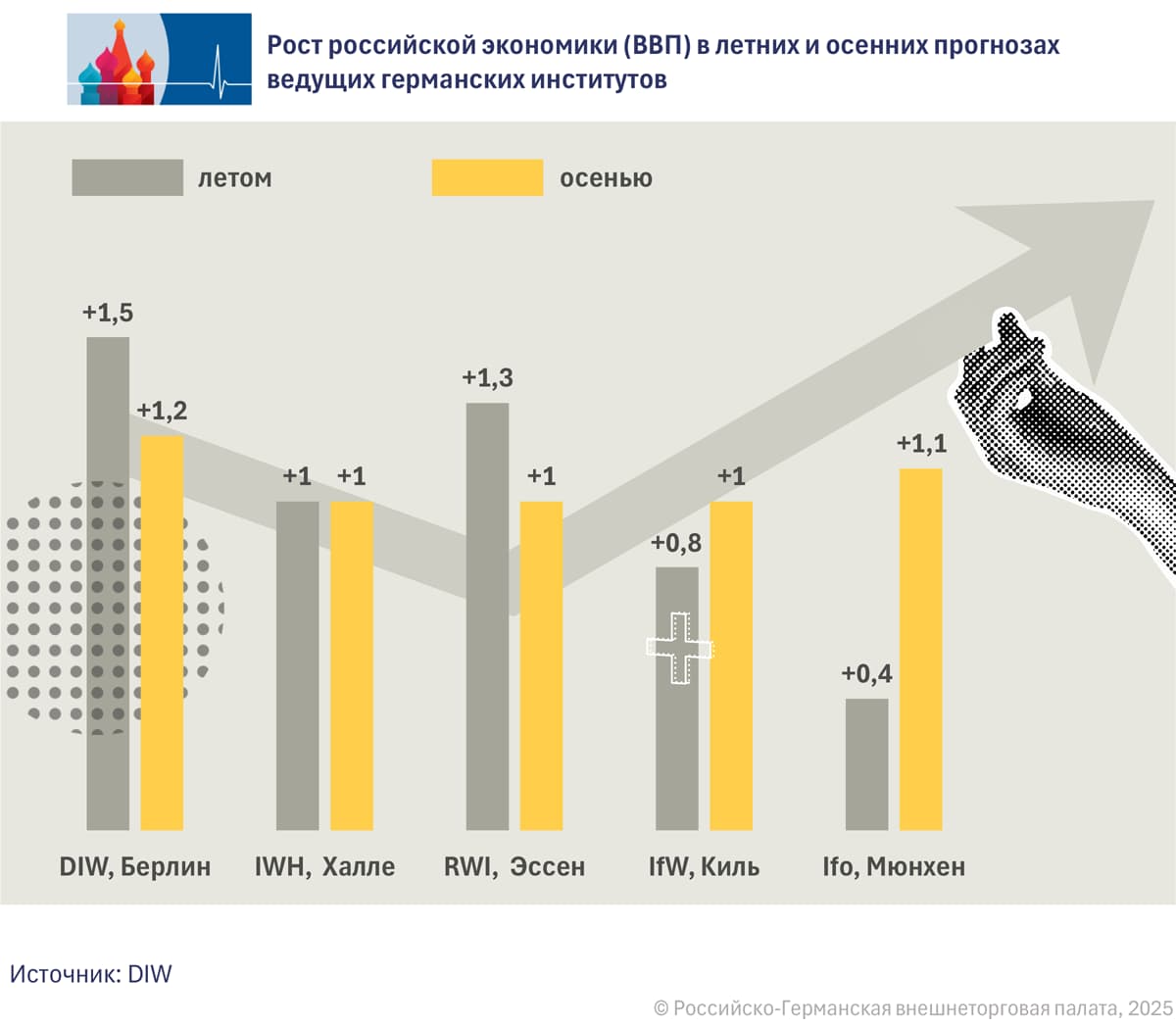 Однако в своих «осенних прогнозах», опубликованных в начале сентября, все пять ведущих экономических НИИ Германии ожидают увеличения ВВП России по итогам 2025 года примерно на 1%. В частности, прогноз DIW ухудшился с 1,5% до 1,2%, прогноз ifo улучшился с 0,4% до 1,1%, а экономисты институтов в Галле, Эссене и Киле прогнозируют рост на уровне 1,0%.