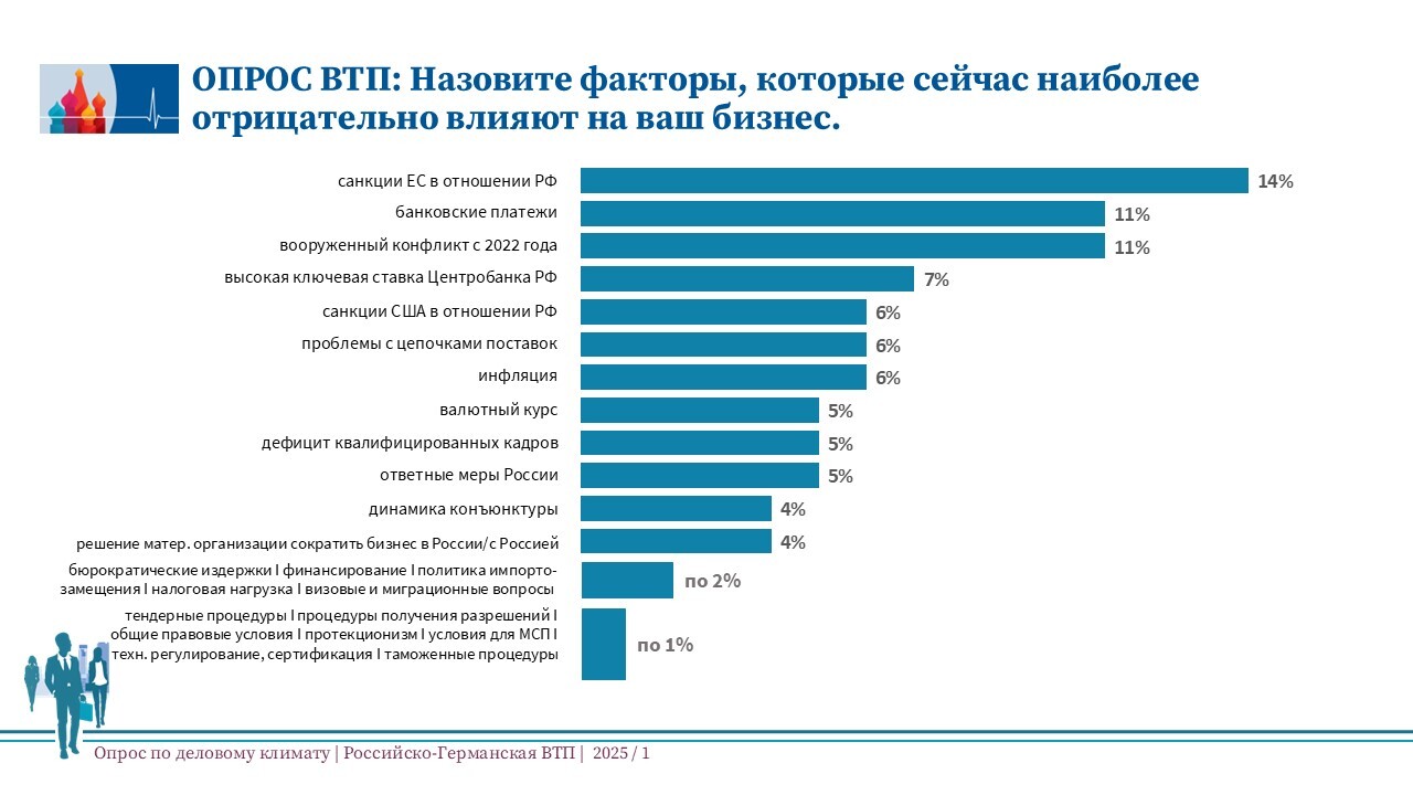 Работу немецкого бизнеса в России в настоящее время серьезно осложняют политически обусловленные препятствия. В ходе опроса по деловому климату, проведенного Российско-Германской ВТП в первом полугодии 2025 года, 14% компаний заявили о негативном влиянии на их бизнес антироссийских санкций ЕС. 11% респондентов среди ограничений, мешающим им работать, назвали проблемы с банковскими переводами, еще столько же упомянули влияние вооруженного конфликта после 24 февраля 2022 года.