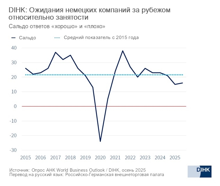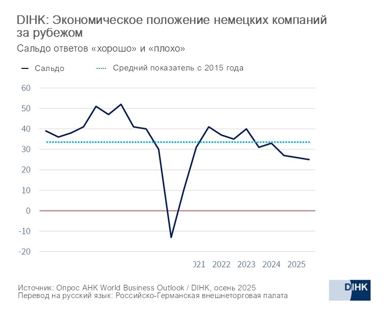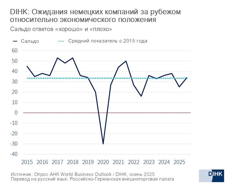В целом настроения немецкого бизнеса за последние полгода улучшились, однако в первую очередь такая тенденция заметна именно среди зарубежных представительств немецких компаний. Всего в рамках исследования World Business Outlook осенью 2025 года Торгово-промышленная палата Германии (DIHK) опросила немецкий бизнес в более чем 90 странах мира. Опрос позволил получить точную информацию о настроениях, текущих оценках и ожиданиях немецких предприятий, ведущих международную деятельность.