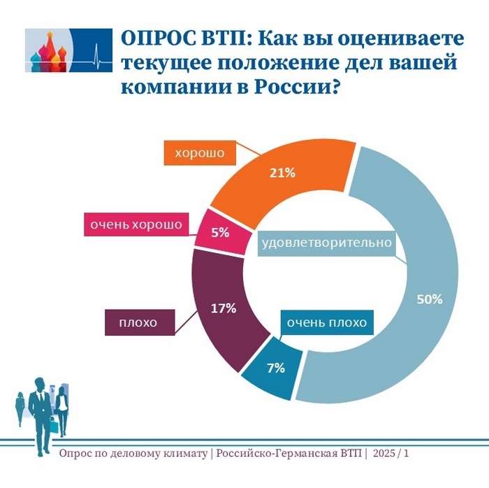 Почти половина (47%) работающих в России немецких предприятий считают, что деловой климат в стране с начала текущего года ухудшился. Еще 17% опрошенных отмечают его позитивную динамику, а около 37% не заметили никаких изменений. Таковы результаты опроса по деловому климату Российско-Германской ВТП, итоги которого были подведены в июле. 50% опрошенных компаний оценили состояние своего бизнеса как удовлетворительное, 26% – как хорошее или очень хорошее, а 24% – как плохое или очень плохое.