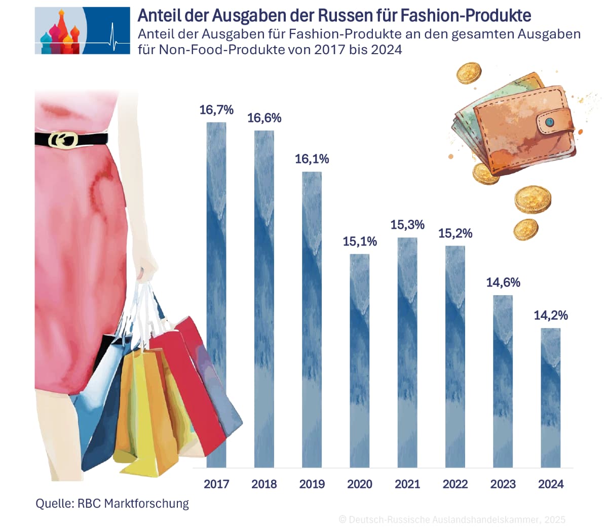 Getrieben wird der nominale Anstieg vor allem durch Inflation infolge verknappter Importe. Der reale Modekonsum bleibt dagegen nahezu stagnierend. Der Anteil der Ausgaben der Russen für Bekleidung an allen Nicht-Essen-Ausgaben sank laut der Wirtschaftszeitung RBC von 16,7% im Jahr 2017 auf 14,2% im Jahr 2024. Damit hat die Modebranche ihren relativen Stellenwert im Konsumkorb verloren, obwohl die Umsätze nominal stark stiegen.