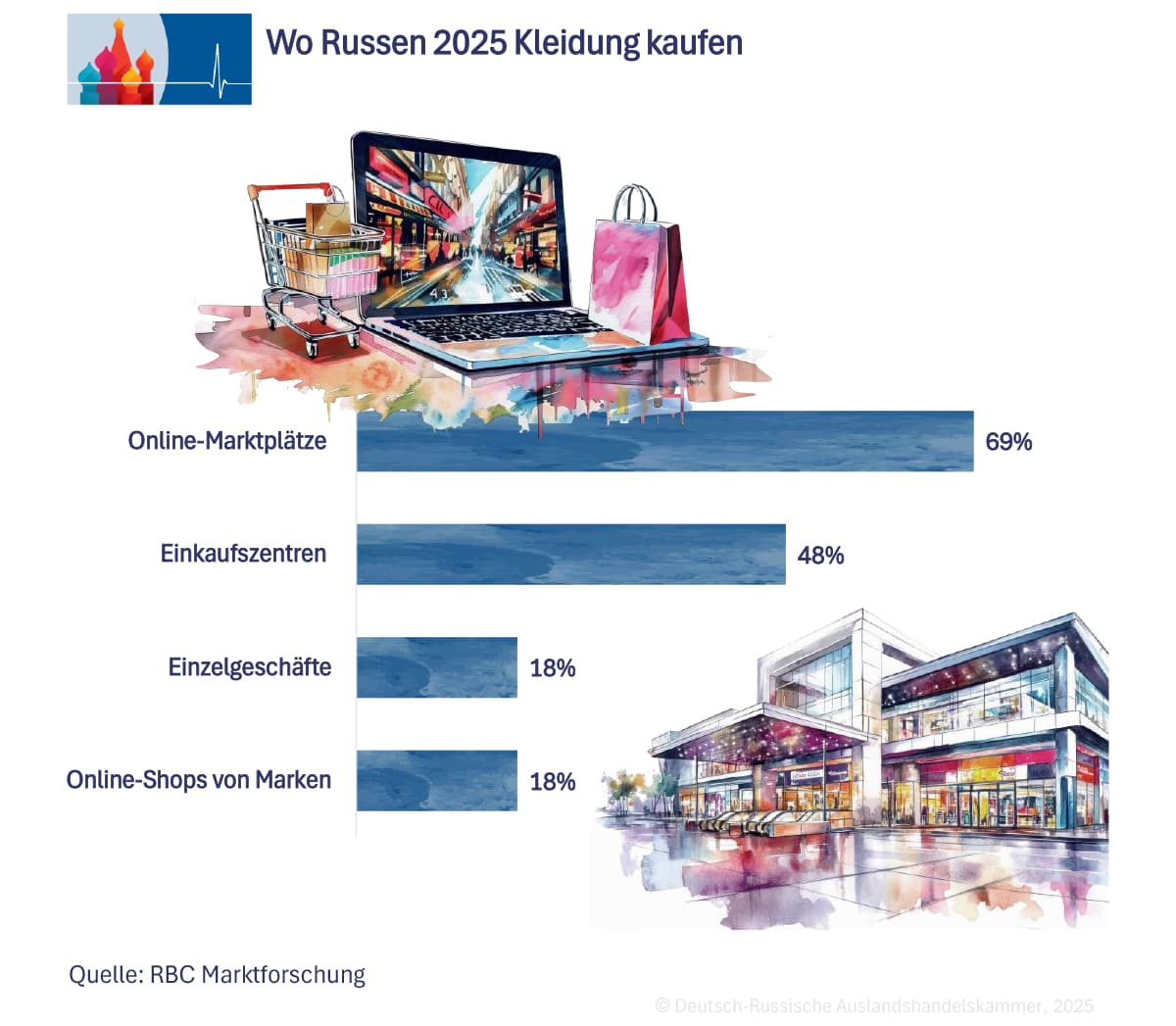 Der Onlinehandel hat sich in Russland zur dominanten Vertriebsschiene entwickelt. Laut RBC-Marktforschung kaufen 2025 bereits 69% der Verbraucher ihre Kleidung über Online-Marktplätze wie Wildberries, Ozon, Yandex Market und Lamoda. Zum Vergleich: 48% nutzen weiterhin Einkaufszentren, 18% Einzelgeschäfte und 18% Online-Shops einzelner Marken. Die Gesamtzahl liegt über 100%, weil viele Verbraucher mehrere Einkaufswege kombinieren. Viele kaufen online, besuchen aber auch Einkaufszentren oder Markengeschäfte. Die Angaben zeigen deshalb, wie verbreitet die einzelnen Kanäle sind, nicht deren Anteil am Gesamtmarkt.