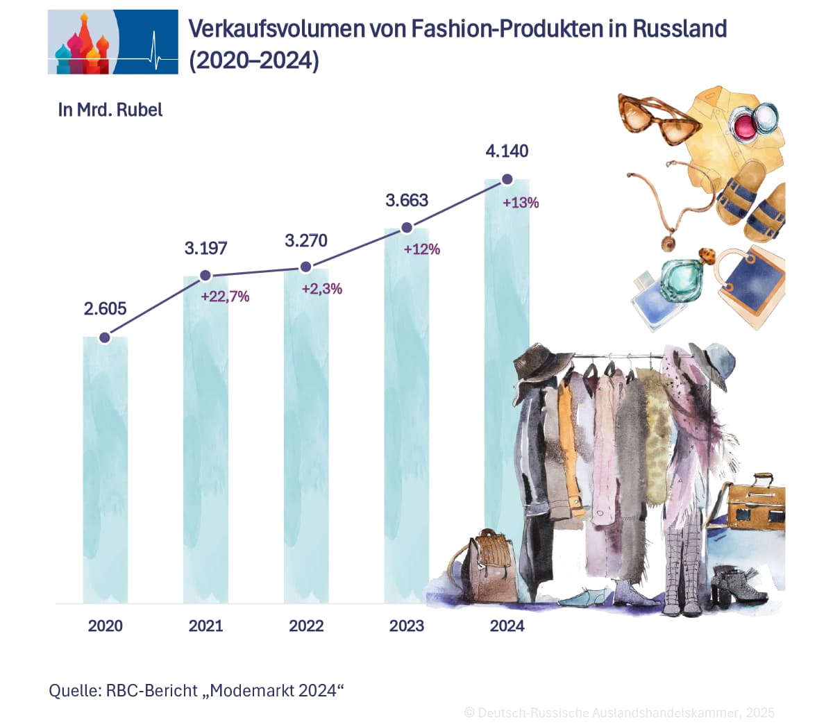 Der russische Modemarkt verzeichnet 2025 in Rubel gerechnet ein historisches Hoch. Nach einem pandemiebedingten Einbruch 2020 auf 2,6 Bio. Rubel, nach aktuellem Umrechnungskurs 27,7 Mrd. Euro, stieg das Marktvolumen laut RBC Research bis 2024 auf 4,1 Bio. Rubel, rund 44 Mrd. Euro. Das entspricht einem nominalen Zuwachs von 59% innerhalb von vier Jahren.