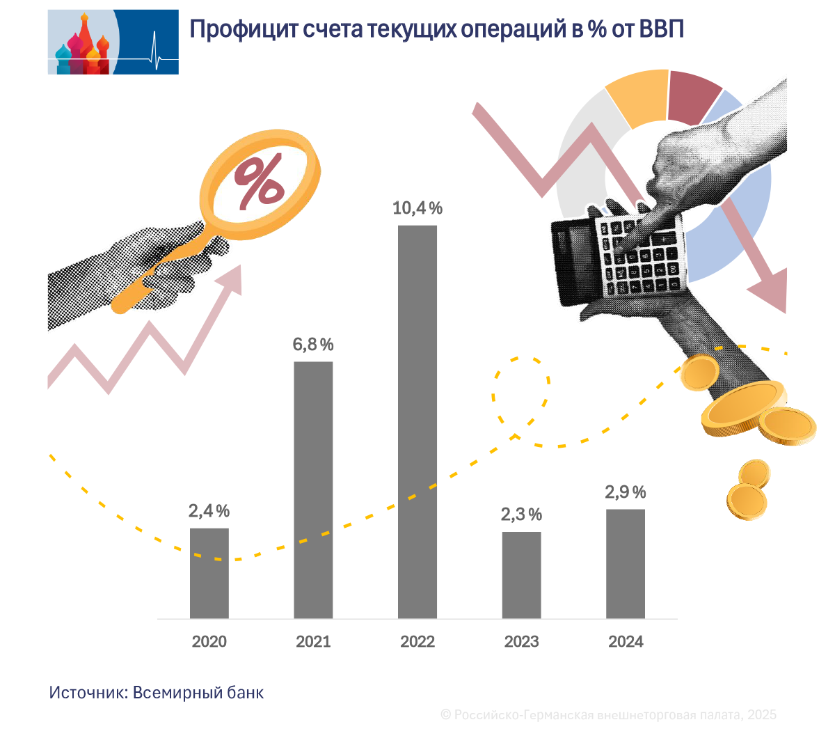 Это напрямую отражается на состоянии счета текущих операций платежного баланса РФ, профицит которого в июне 2025 года, по данным ЦБ, составил 0,7 млрд долларов против 2,8 млрд долларов в мае. Во втором квартале 2025 года профицит счета текущих операций платежного баланса, по данным ЦБ, также серьезно снизился год к году, что было обусловлено сокращением экспорта и ростом импорта.