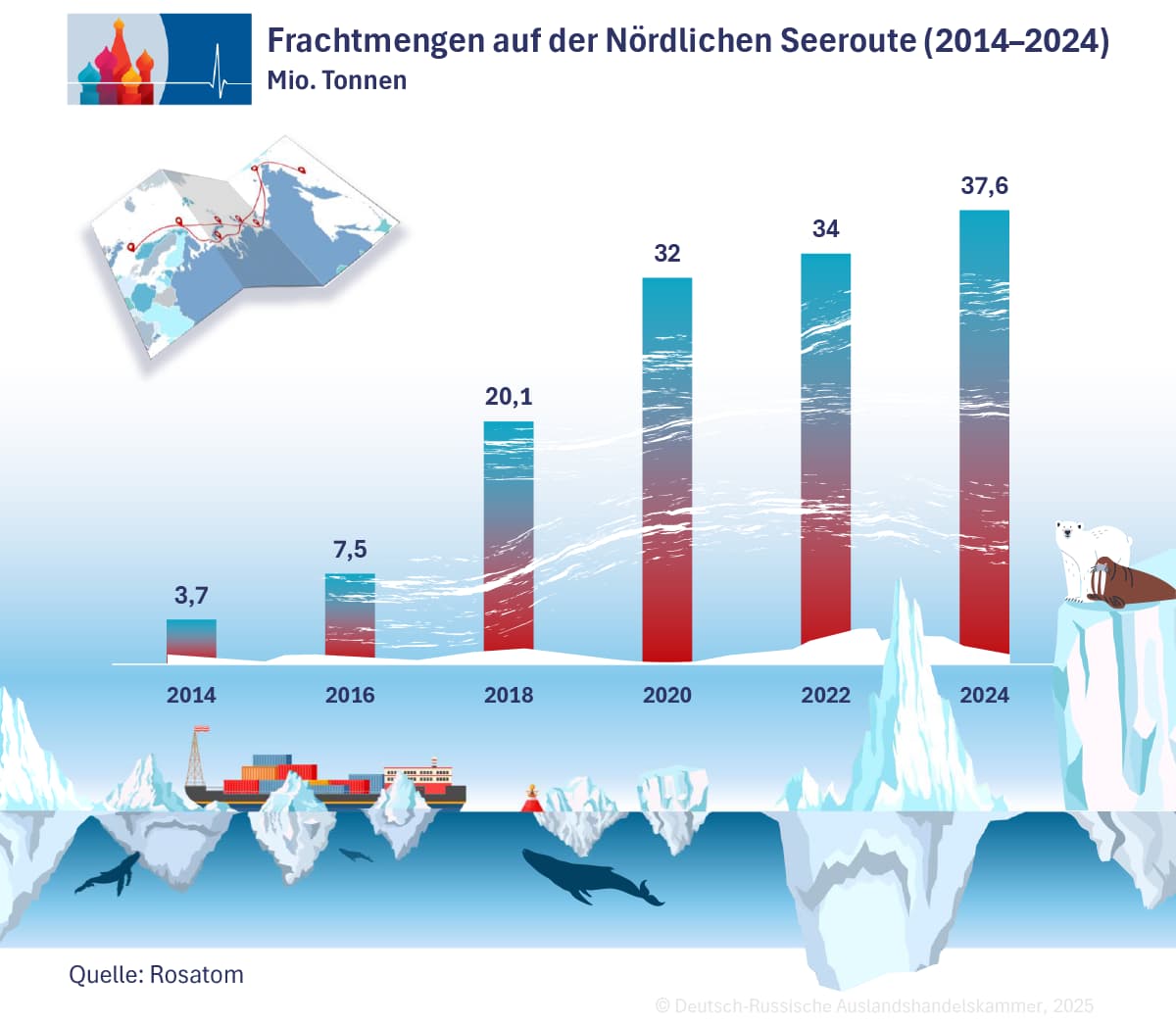 Die 2020 verabschiedete russische Arktisstrategie bis 2035 sieht eine weitreichende Entwicklung von Infrastruktur, Rohstoffgewinnung und Schifffahrt vor. Im Zentrum steht der Ausbau der Nördlichen Seeroute (NSR), die sich als zentrale Verbindung zwischen Europa und Asien etablieren soll. Laut Angaben des russischen Verkehrsministeriums sollte das Transportvolumen auf der NSR von 34 Mio. Tonnen im Jahr 2022 auf 80 Mio. Tonnen bis 2024 und auf 130 Mio. Tonnen bis 2035 steigen. Das Ziel für 2024 wurde jedoch deutlich verfehlt: Tatsächlich transportierte Rosatom nur rund 36 Mio. Tonnen. Sanktionen, ein Mangel an geeigneten Schiffen und hohe Versicherungskosten gelten als zentrale Hemmnisse.
