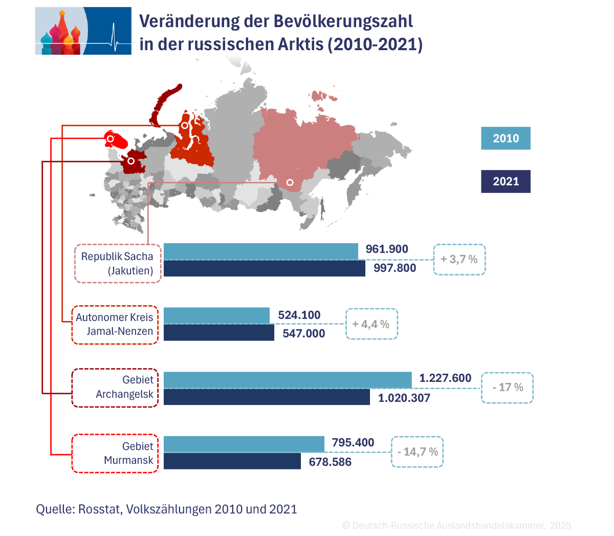Der Arktisexperte Lukas Wahden kommentiert im Kammer-Podcast die Bedeutung des ewigen Eises für die russische Wirtschaft: „Rund 80% des russischen Erdgases und 17% des Erdöls stammen bereits aus der Arktis. Im Festlandsockel werden über 85 Bio. m³ Gas und knapp 20 Mrd. Tonnen Öl vermutet – etwa 70% der unerschlossenen Vorkommen. Es ist Russlands Ziel, bis 2030 die Produktion zu steigern: bei Rohöl um 35%, bei der Flüssiggas-Produktion um mehr als 600%. Da Pipelines gen Westeuropa brachliegen, gewinnt die Nordostpassage als Seeweg an Gewicht.“