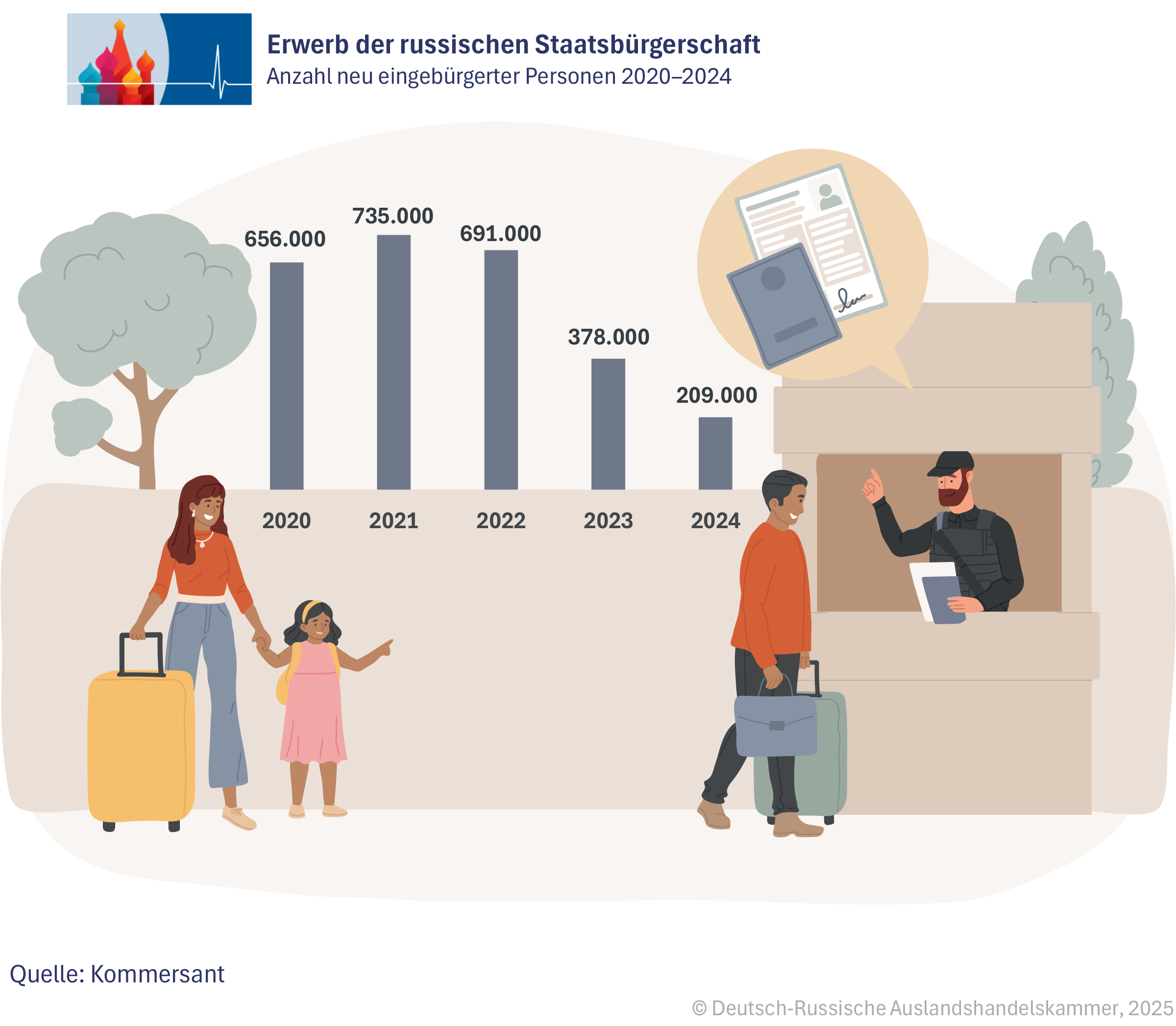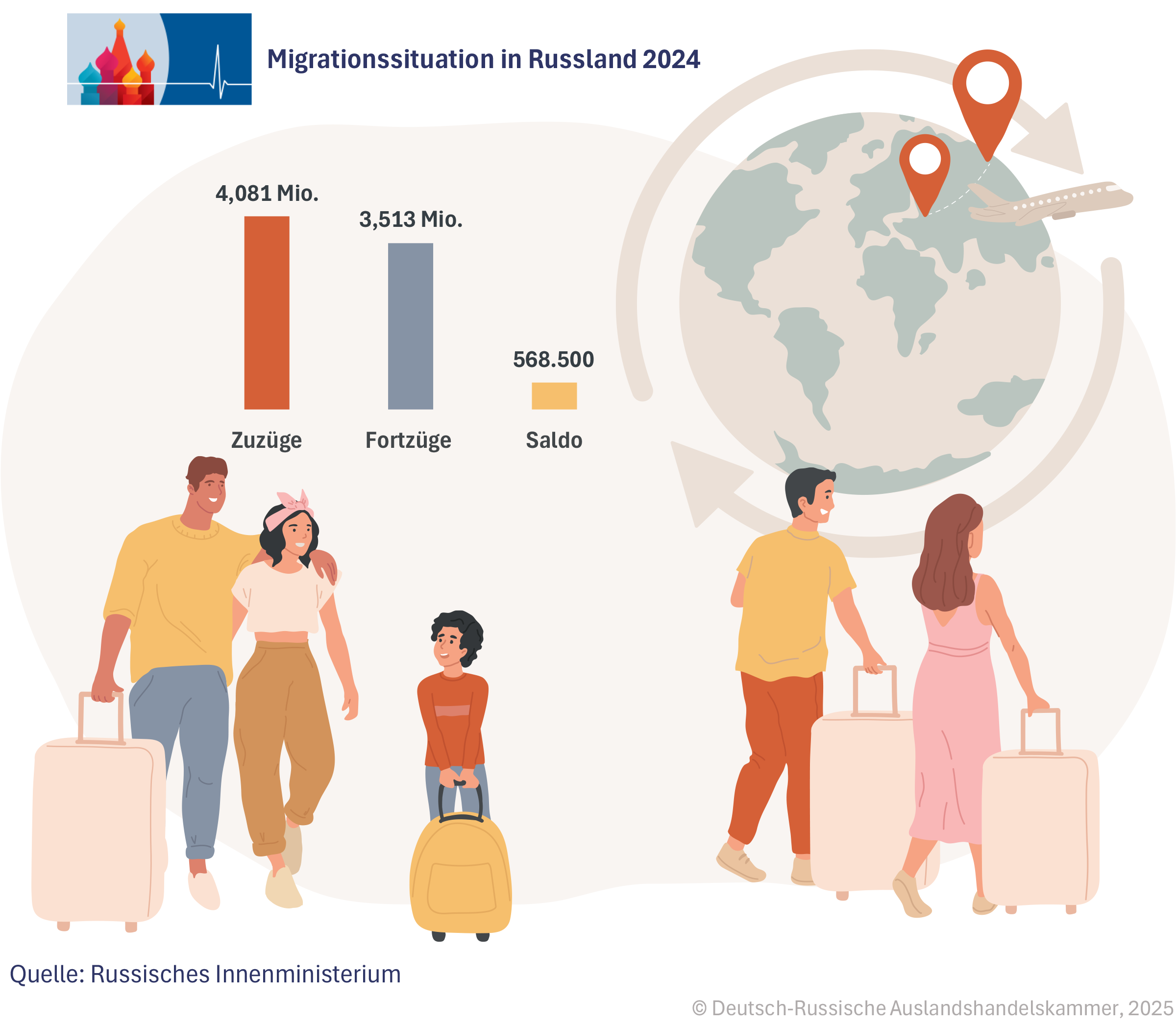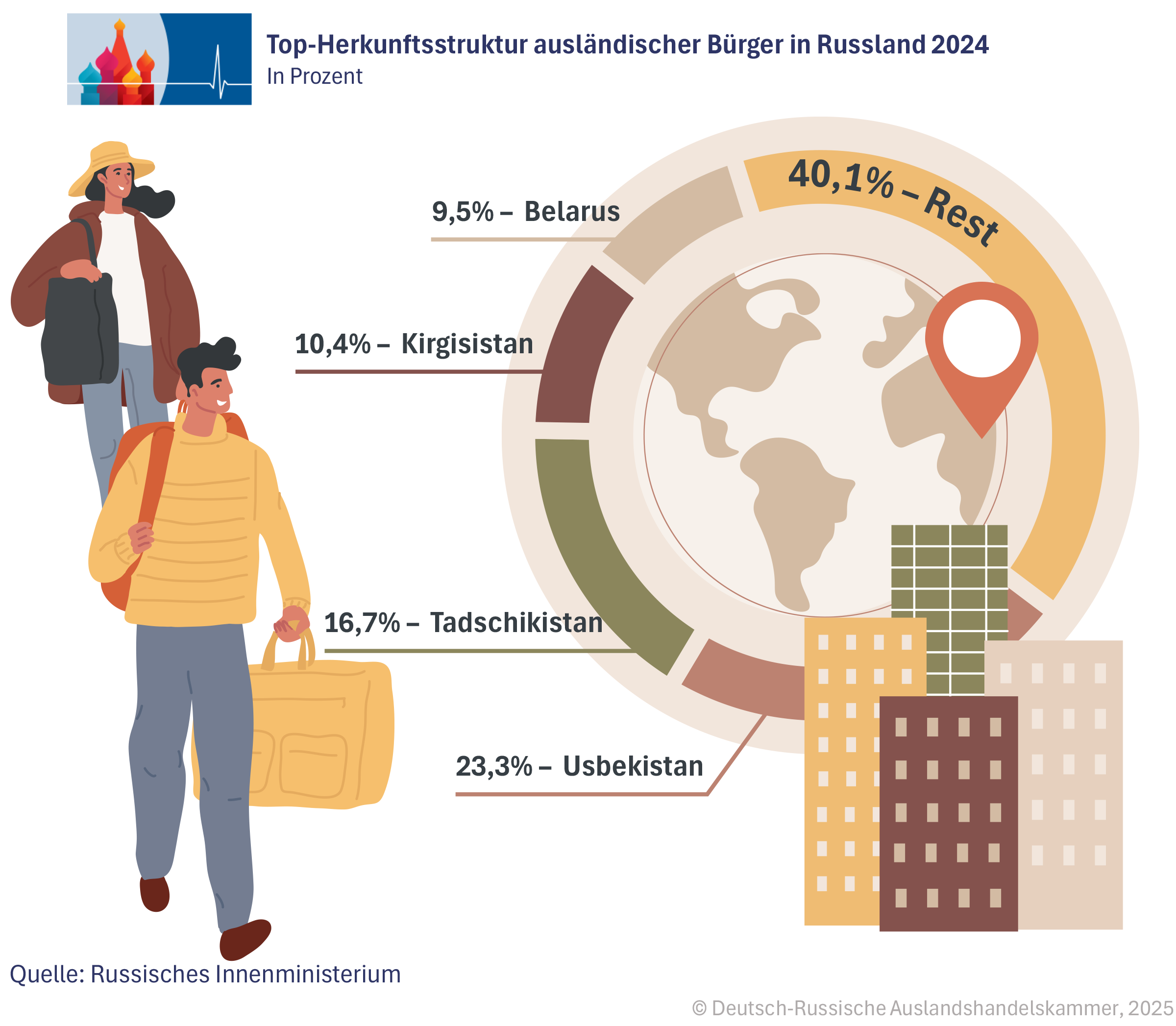 Damit nähert sich Russland wieder dem Vorkrisenniveau von 2019, als 6,8 Mio. Ausländer gezählt wurden. Nach dem pandemiebedingten Einbruch 2020 auf nur 1,1 Mio. und der allmählichen Erholung 2021 mit 2,6 Mio. und 2022 mit 3,5 Mio. setzt sich der Trend fort: Russland bleibt trotz strengerer Gesetzgebung und wachsender gesellschaftlicher Skepsis ein Magnet für Arbeitsmigranten.