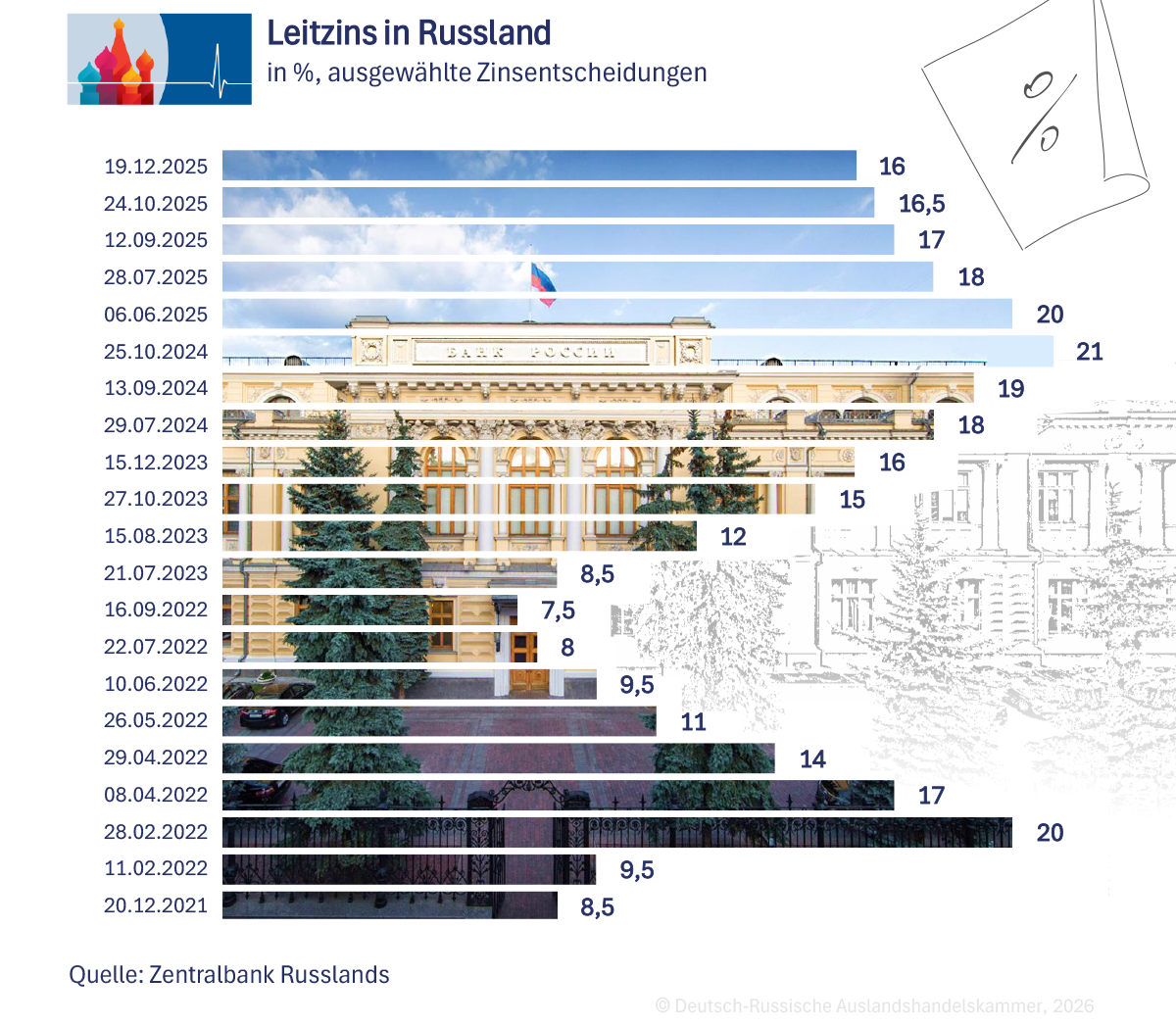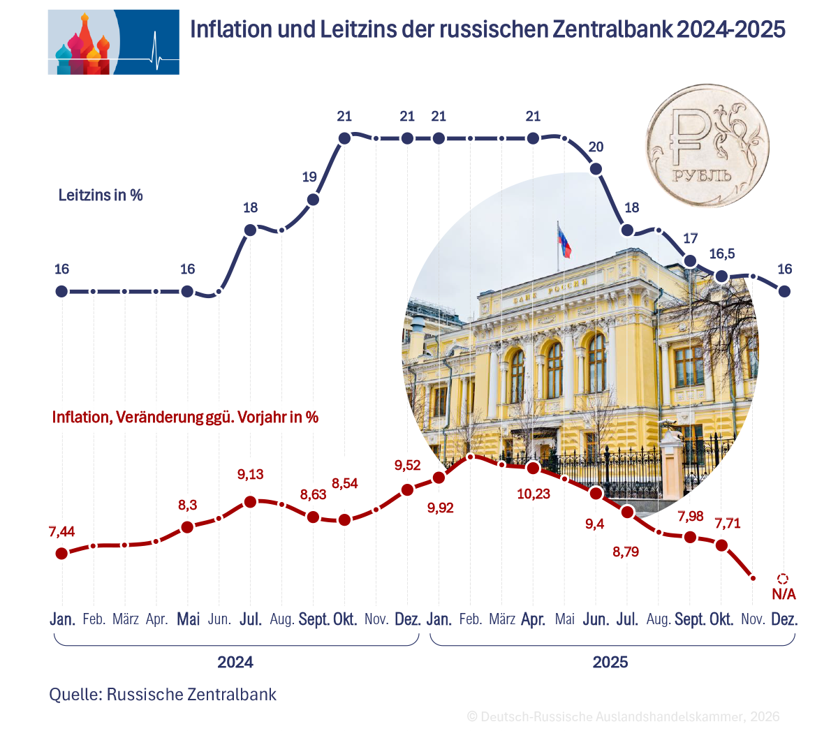 Im ausklingenden Jahr haben die geldpolitischen Straffungen der russischen Zentralbank Wirkung gezeigt: Die Inflation befindet sich auf dem Rückzug. Mitte Dezember lag die Teuerungsrate nach Angaben der Währungshüter bei 5,8% im Jahresvergleich. Bis zum Jahresende dürfte sie unter 6% bleiben, erklärte die Zentralbank am 19. Dezember, nachdem sie den Leitzins von 16,5 auf 16% gesenkt hatte. Anfang 2025 hatte die russische Inflationsrate noch bei knapp 10% gelegen.