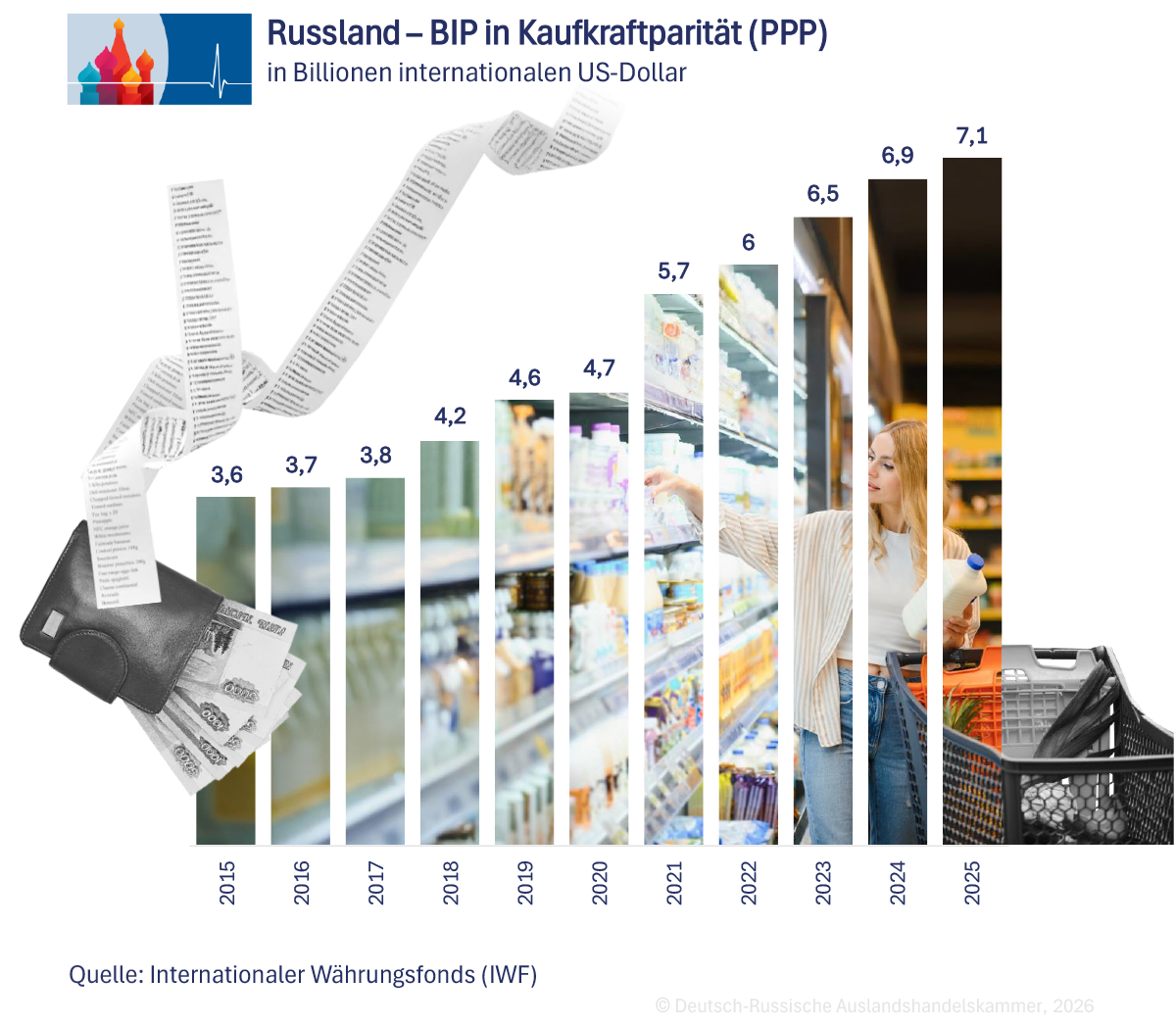 Ungeachtet der geplanten Mehrwertsteuererhöhung und einer möglichen Rubel-Abwertung könnte sich der Anstieg der Verbrauchernachfrage 2026 auf 1,5% verlangsamen und die Inflation zum Jahresende auf 4,8% absinken, schätzt die russische Alfa-Bank. Professor Oleg Schibanow von der privaten Moskauer Wirtschaftshochschule „New Economic School“ erwartet für 2026 einen Rückgang der Inflationsrate auf 5,2%, wozu insbesondere eine Abkühlung des privaten Konsums infolge eines langsameren Wachstums der Löhne beitragen soll.