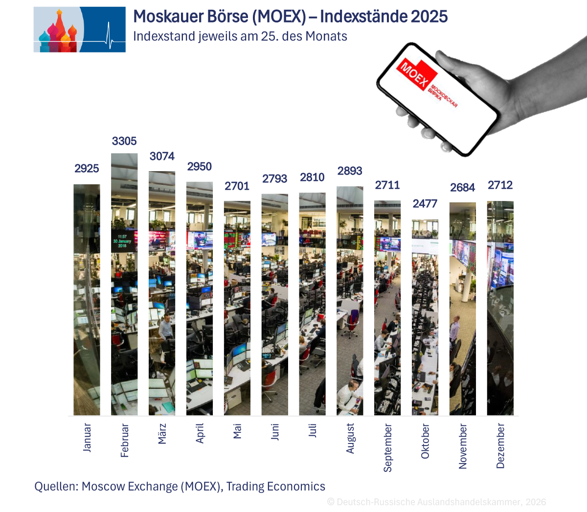 Zudem könnte ein zu rascher Rubelverfall Inflation und Kapitalflucht schüren. Kurzfristig könnten auch andere Faktoren bremsen: Anfang 2026 belasten eine höher besteuerte Ölbranche und der erneut robuste Rubel die Unternehmensgewinne. Mittelfristig überwiegen aber die positiven Impulse: Mit jeder Zinssenkung der Zentralbank verbessert sich die Finanzierungssituation der Firmen, und heimische Investoren dürften verstärkt aus Bankeinlagen in Dividendenpapiere umschichten.