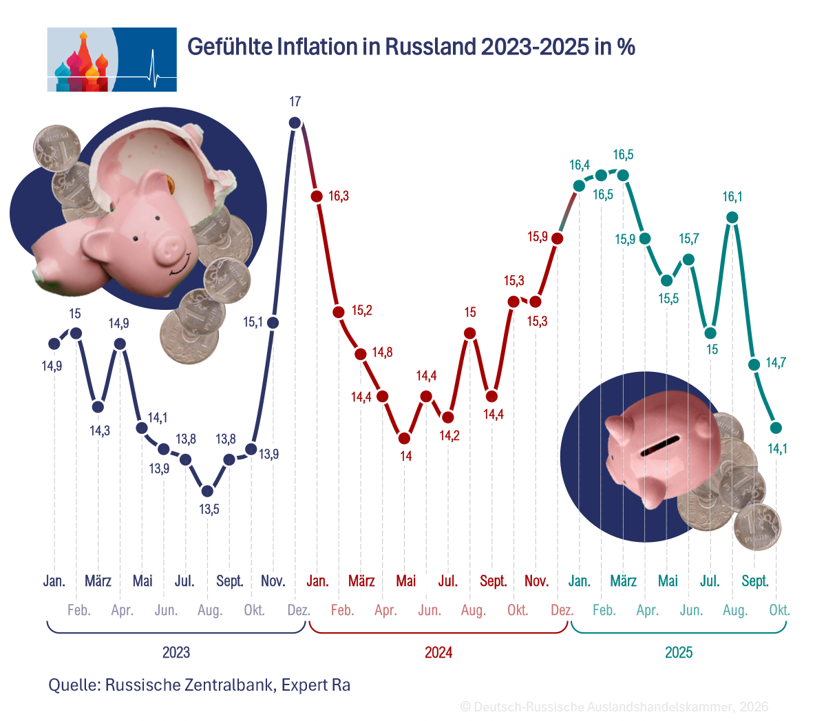 Die Inflationserwartungen der russischen Bevölkerung aber sind inzwischen sogar gestiegen. Im Dezember beliefen sie sich auf 13,7%, nach 13,3% im November, wie eine Umfrage des Meinungsforschungsinstituts inFOM im Auftrag der Zentralbank ergab. Der Wert bezeichnet den im Mittel erwarteten Preisanstieg in den kommenden zwölf Monaten. Im Jahresverlauf 2025 bewegten sich die Inflationserwartungen auf stabil hohem Niveau zwischen 12,6 und 14%. Hohe Inflationserwartungen der Bevölkerung können bei zu schnellen Zinssenkungen einen Nachfrageboom und eine neue Inflationswelle auslösen.