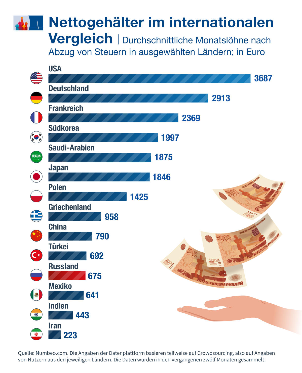 Trotz des Wachstums der vergangenen Jahre sind die russischen Gehälter im internationalen Vergleich niedrig. Eine Perspektive auf ihre Höhe bietet die in Belgrad ansässige Statistikplattform Numbeo. Sie sammelt insbesondere Daten zu Lebenshaltungskosten weltweit, vergleicht aber auch die Durchschnittsgehälter nach Steuern. Die Zahlen verdanken sich dem „Crowdsourcing“, werden also teilweise von den Nutzern der Plattform in den jeweiligen Ländern erhoben. Demnach lag Russland Mitte August mit einem Netto-Durchschnitt von 675 Euro pro Monat auf Platz 63 unter 128 verglichenen Ländern, unmittelbar hinter der Türkei (692 Euro) und vor Mexiko (641 Euro). Deutschland belegte mit 2913 Euro den 13. Platz.