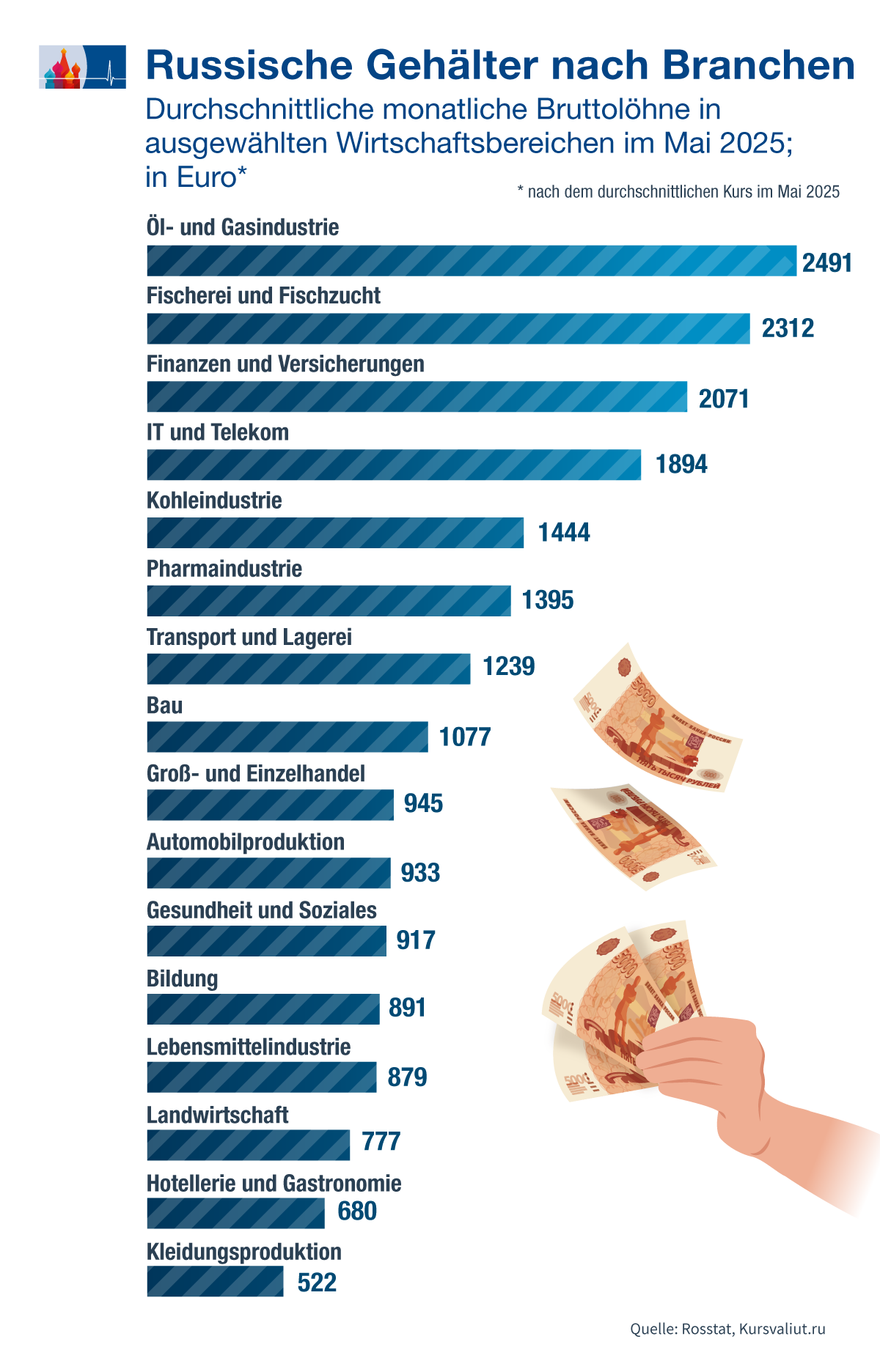 Der Leiter des staatlichen Meinungsforschungsinstituts WZIOM, Walerij Fjodorow, sah Ende Juni 2025 Russland auf dem Weg zu einer „Hochlohn-Wirtschaft“. Angesichts der niedrigen Arbeitslosigkeit und einer schrumpfenden Bevölkerung müssten sich die Arbeitgeber mit den hohen Gehältern abfinden, konstatierte er.