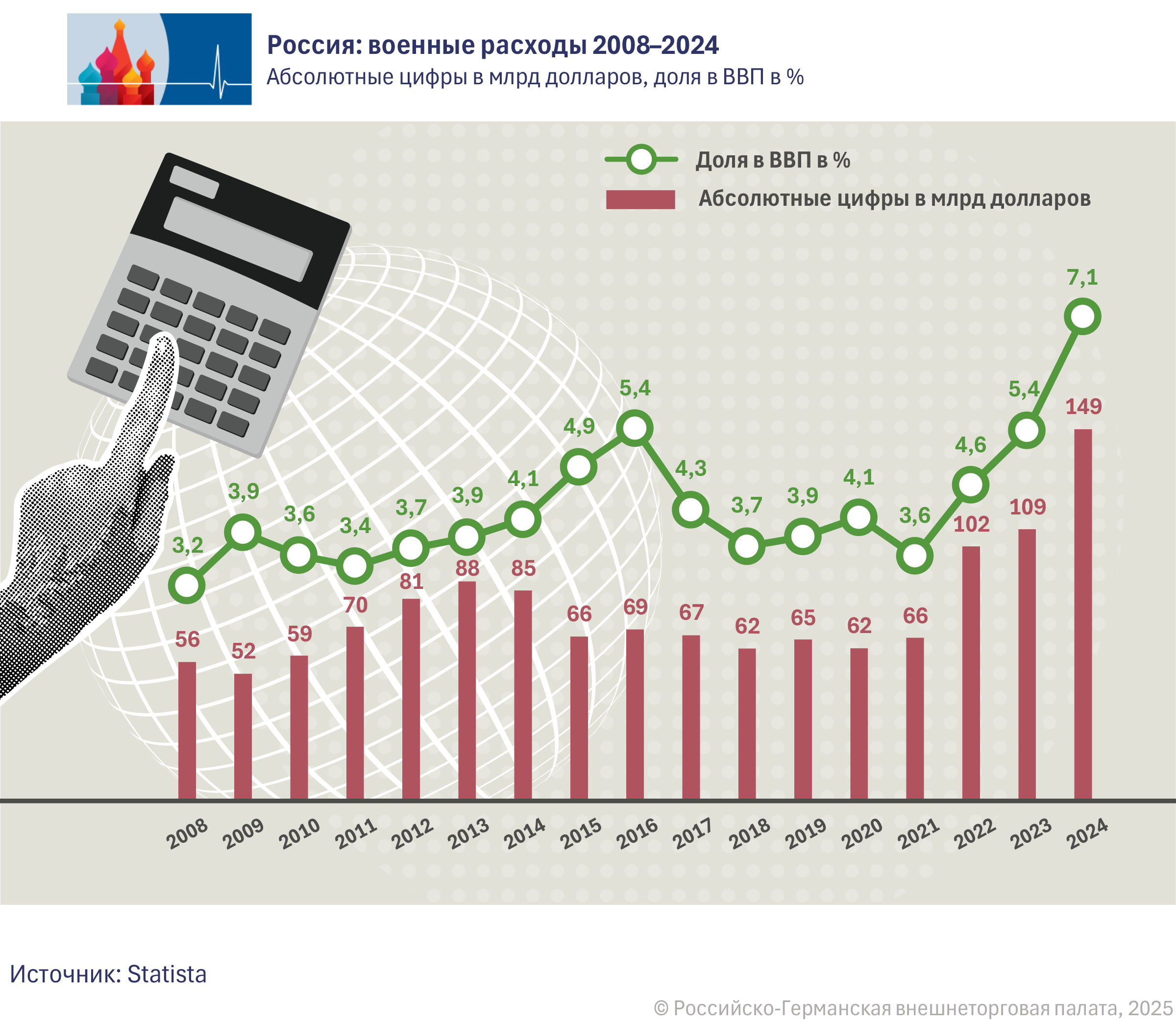 Стокгольмский международный институт исследований проблем (SIPRI) ежегодно публикует исследования по динамике глобальных военных расходов. По его оценке, доля военных расходов России в ВВП за первые три года конфликта на Украине увеличилась примерно вдвое: если в 2021 году, т. е. за год до начала конфликта, она составляла 3,6% ВВП, то в 2024 году – уже 7,1%. Объем российских оборонных расходов в долларах вырос даже сильнее, чем их доля в ВВП – с 66 млрд долларов в 2021 году, до 149 млрд долларов в 2024-м.