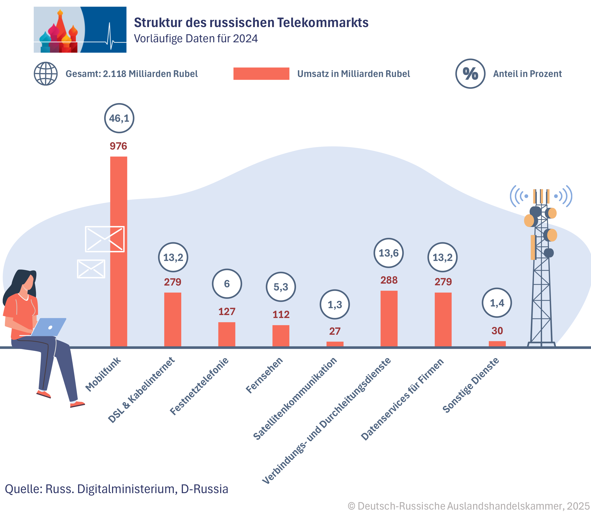 Der russische Markt für Telekommunikation belief sich im vergangenen Jahr auf knapp über 2 Bio. Rubel (21 Mrd. Euro), 6,2% mehr als 2023. Das berichtet die russische Internetbank T-Bank in ihrer Marktstudie, die sich auf Daten des Beratungsunternehmens TMT Consulting stützt. Laut dem Digitalministerium ist der Markt um 7,8% auf 2,1 Bio. Rubel (22 Mrd. Euro) gewachsen. Zur Einordnung: Der deutsche Marktführer, die Deutsche Telekom, erzielte 2024 auf dem Heimatmarkt einen Umsatz von 25,7 Mrd. Euro. Den gesamten deutschen Telekommarkt schätzte der Verband Bitkom auf 73,3 Mrd. Euro. Das russische Marktvolumen entspricht dem des Apothekenmarkts, der im vergangenen Jahr 2 Bio. Rubel groß war. Die schnell wachsende Softwarebranche hat 2024 laut dem Branchenverband Russoft allein im Inland fast 2 Bio. Rubel erlöst, 28% mehr als im Vorjahr.
