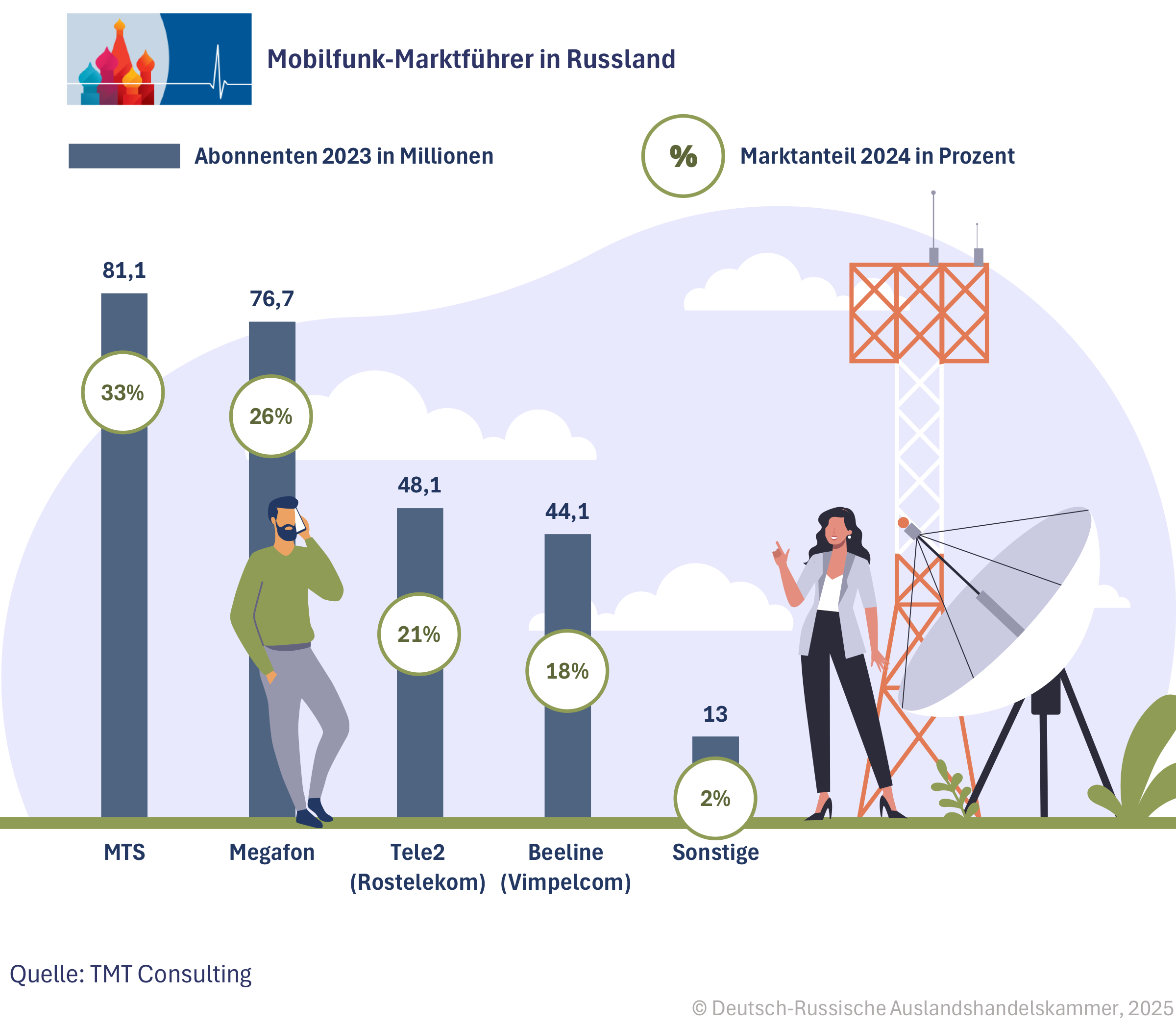 In der Vergangenheit ließ der Übergang von 3G auf 4G den Markt wachsen, doch inzwischen ist auch hier das Potenzial erschöpft. Im Oktober 2024 hatte 4G russlandweit einen Anteil von 96,5% am mobilen Datenverkehr, vier Prozentpunkte mehr als ein Jahr zuvor, berichtete die Netzmonitoring-Firma Vigo.