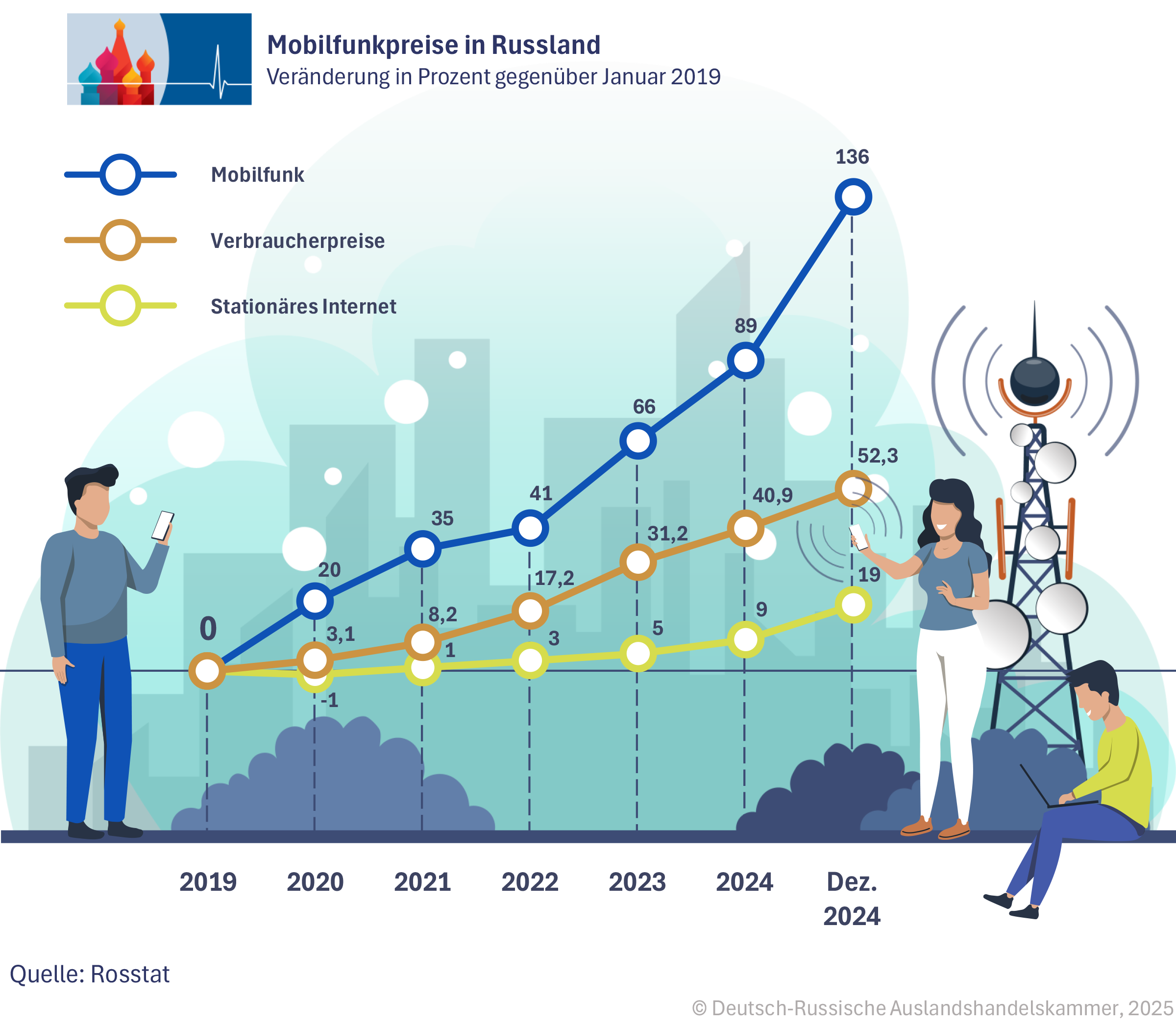 Daten der Statistikbehörde Rosstat zeigen, dass die Mobilfunkanbieter ihre Preise in Krisenzeiten stärker anheben als der Rest der Wirtschaft. Nimmt man das Preisniveau von Januar 2019 als Ausgangspunkt, machten die Mobilfunkpakete zwischen Februar und Juni 2020 einen Teuerungssprung von 20% auf 33% gegenüber dem Basiswert. Der allgemeine Verbraucherpreisindex stieg im selben Zeitraum von 3,5% auf 5,6%. Der zweite Preisschub bei den Mobilfunkpaketen begann im Frühjahr 2022 und dauerte mindestens bis Herbst 2024. So weit reichen die Daten im Branchenbericht von T-Bank. In diesem Zeitraum stieg der Mobilfunk-Preisindex von 41% auf 136%, während der allgemeine Preisindex zwischen März 2022 und Oktober 2024 von 19,8% auf 52,3% zulegte. Für Dezember 2024 meldete Rosstat einen Anstieg der Mobilfunkpreise um 14% im Jahresvergleich, was deutlich über der Inflationsrate von rund 9% lag.