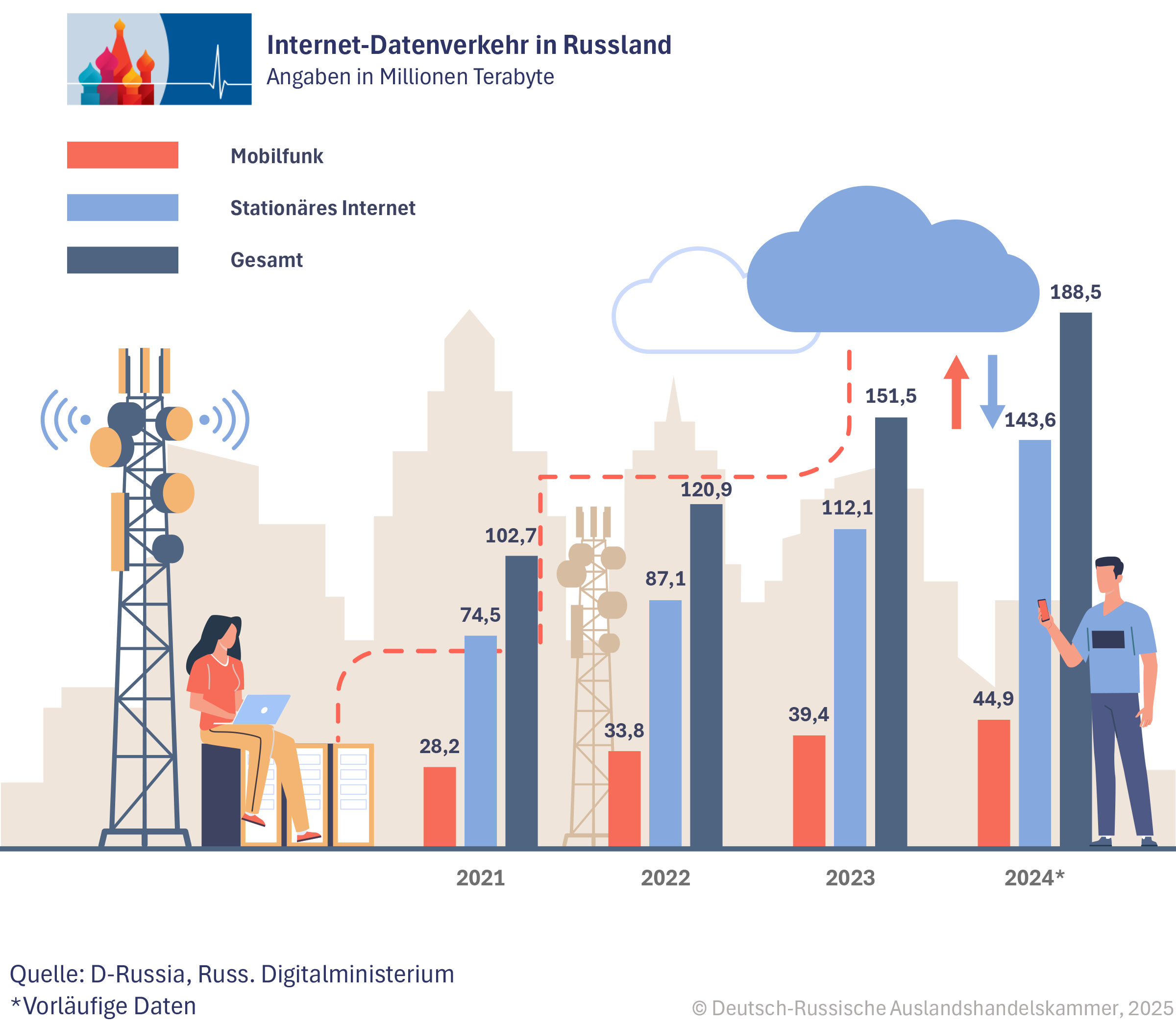 Eine Investitionsoffensive, um dem russischen Netz wieder auf die Sprünge zu helfen, ist bisher ausgeblieben. Erst 2024 erreichten die Investitionen der Telekomunternehmen in ihre Infrastruktur wieder das vorpandemische Niveau von knapp 300 Mrd. Rubel (3 Mrd. Euro), teilte Digitalminister Maksut Schadajew mit. Davon flossen 209 Mrd. Rubel (2,15 Mrd. Euro) in die Mobilfunknetze, 21% mehr als 2023. Delovoy Profil schätzt in seinem Branchenbericht, dass die gesamten Telekom-Investitionen im vergangenen Jahr um 15% auf 350 Mrd. Rubel (3,6 Mrd. Euro) gestiegen sind.