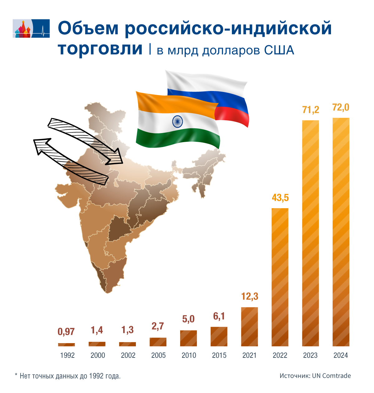«У России и Индии огромный дисбаланс в торговле. Если Россия за прошлый год экспортировала в Индию нефти, удобрений и других товаров на 64 млрд долларов, то поставки индийской продукции в Россию не достигли и 5 млрд долларов. <...> Россия хоть и остается основным поставщиком вооружений в Индию, однако в последнее время военно-техническое сотрудничество застопорилось. Индия до сих пор не получила два дивизиона ЗРК С-400 по договору от 2018 года. Заминка связана с тем, что российская оборонная промышленность сильно перегружена собственными потребностями по Украине».